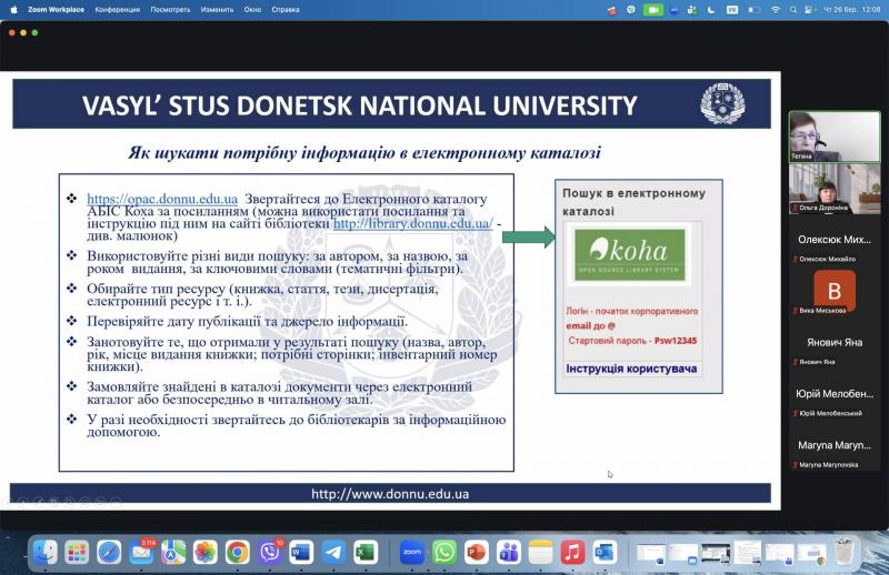 Під час презентації «Навчання з підтримкою: бібліотечні ресурси для кожного студента» здобувачі-магістри ознайомилися із основними можливостями університетської бібліотеки та інструментами, які допоможуть їм під час навчання та написання магістерських робіт, зокрема: